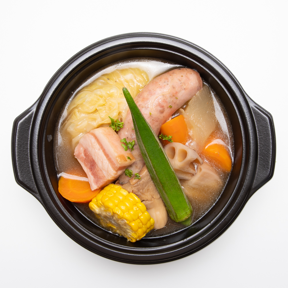 ソーセージとベーコンをゴロゴロ野菜と一緒にスープで煮込みました。