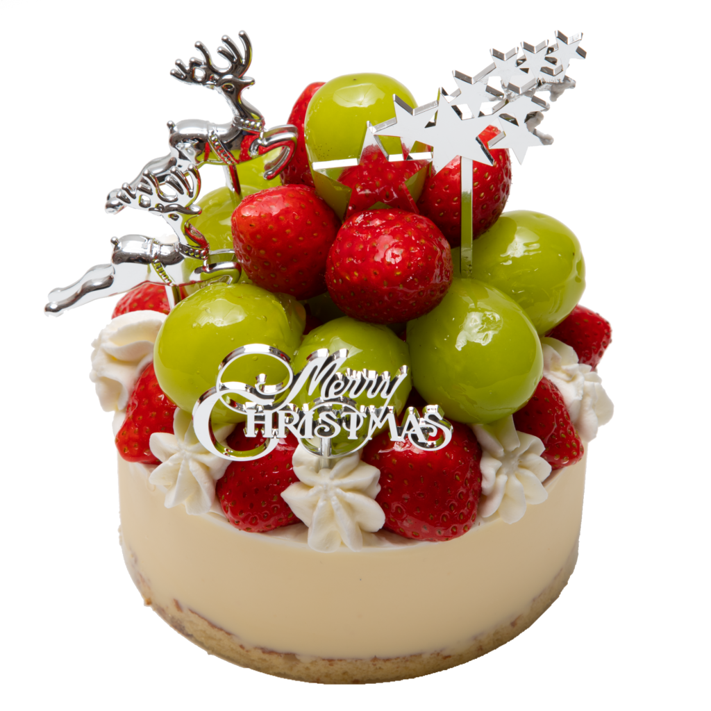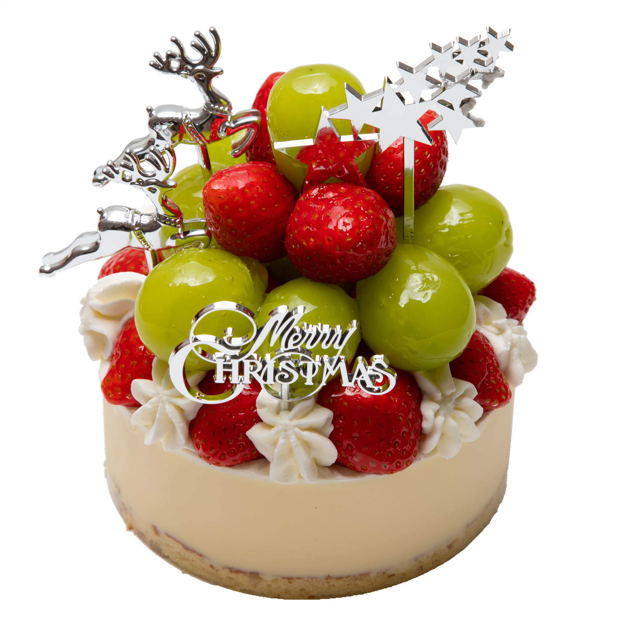 説明:千葉県『和田農園』さんの苺と山形県『Farm おとらふ』さんのシャインマスカットをレアチーズケーキの上に華やかに飾り付けクリスマスムードを演出しました。